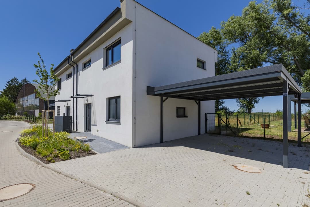 Pohled na moderní rodinný dům s promyšleným využitím venkovního prostoru.