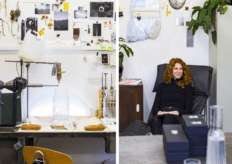 Nalevo: Na tomto místě Eliška vytváří pro ni charakteristické rytiny. Napravo: Eliška Monsportová ve svém ateliéru. Foto: LEXXUS NORTON.