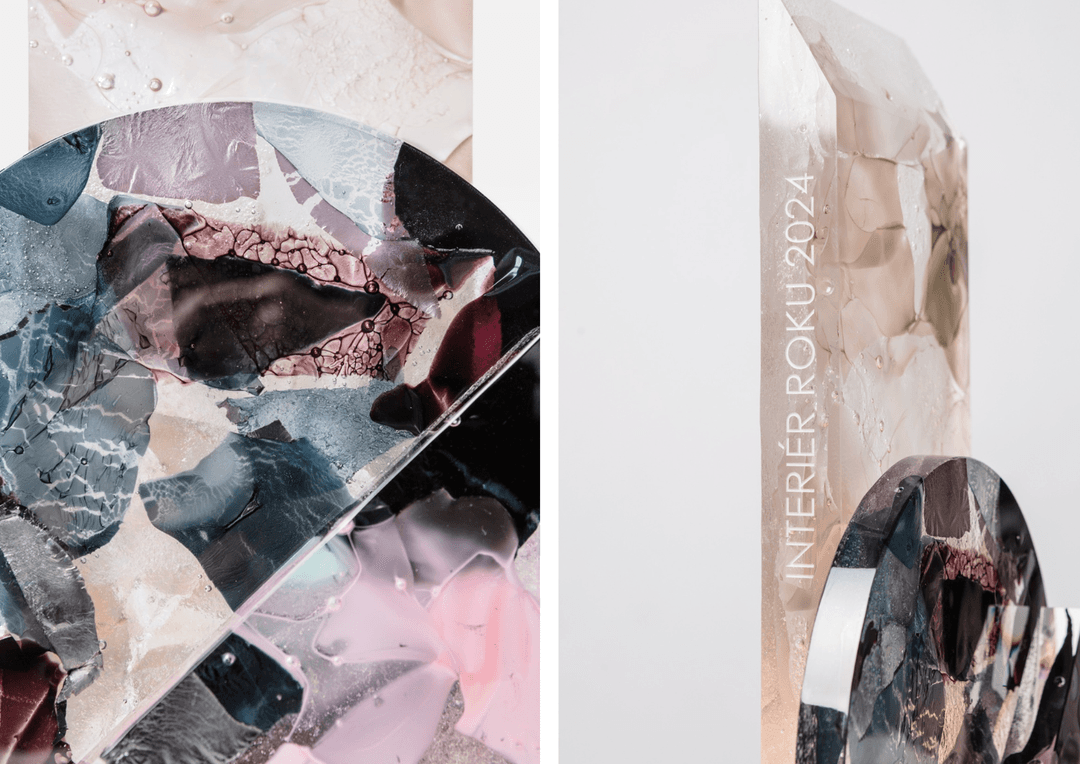 Cena pro jubilejní desátý ročník Interiéru roku je tvořena geometrickými plochami skla, vyrobenými stavením odpadních střepů. Tuto technologii nazvali autoři ze studia Dechem Fragmentglas. Objekt je podsvícený a představuje metaforu architektury viděné očima autorů. Foto: Kristina Hrabětová