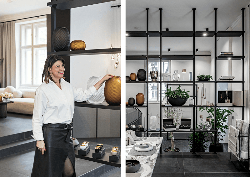 Nalevo: Majitelka LA TABLE Regina Sieberová u váz Rückl. Foto: LEXXUS NORTON. Napravo: Interiér LA TABLE. Foto: Martin Svoboda pro OOOOX.