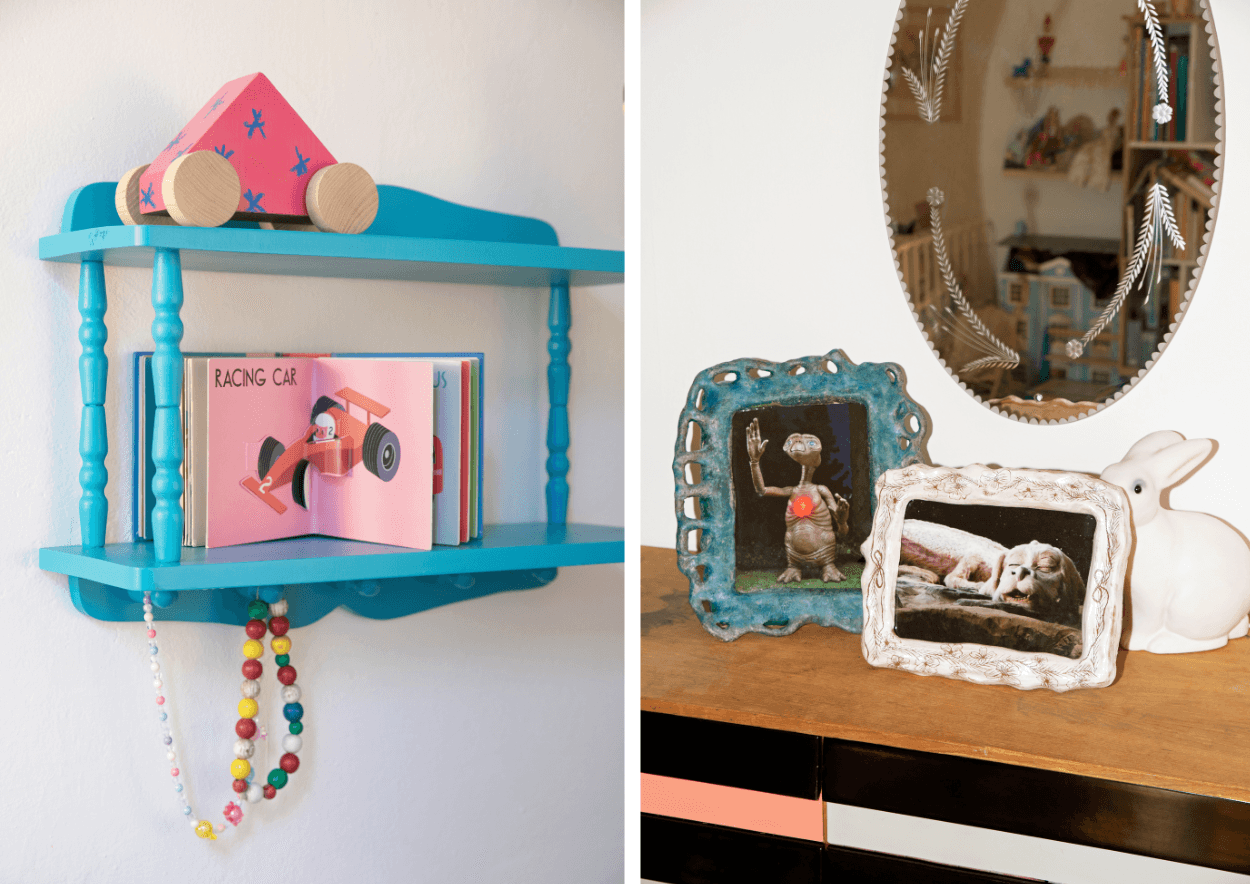 Polička Jurkovič 1 v krásné tyrkysové barvě si už svou cestu do dětského pokoje našla (nalevo). Umělecky pojaté fotorámečky odkazující na filmové hity Nekonečný příběh a E.T. Mimozemšťan. Foto: Michaela Karásek Čejková.