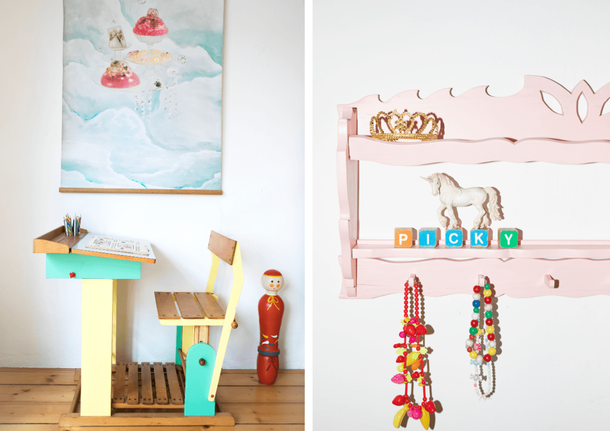 Dětská školní lavice přibližně z 50. let dostala nátěr v pastelových barvách inspirovaných filmem Pipi dlouhá punčocha. Sedák s podnožkou je nastavitelný podle růstu dítěte (nalevo). Polička, která původně sloužila v kuchyni pravděpodobně na kořenky byla přetvořena v poličku do dětského pokoje. Foto: Michaela Karásek Čejková.