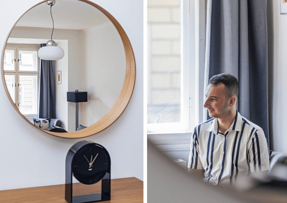 V tomto konkrétním bytu žiji více než pět let. V době, kdy jsem jej teprve hledal, jsem měl vybráno několik bytů, které se mi podle inzerátu líbily. Tento mezi nimi nebyl, ale kamarádka, která mi pomáhala s obvoláváním realitních kanceláří, mi v něm domluvila prohlídku. Vůbec se mi na ni nechtělo, ale šel jsem. Byl to první byt, který jsem viděl a při jeho prohlídce i láska na první pohled. Zaujal mě navíc krásný zelený a čistý vnitroblok, který obyvatelé domu mohou využívat. V této lokalitě jsem ale doma už mnohem déle, přes deset let. Prvním domovem se mi tu stala prostorově štědrá garsonka, do které jsem se přestěhoval poté, co jsem žil nějakou dobu v zahraničí.