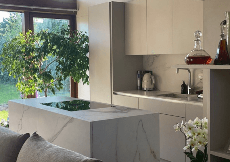 Nadčasová kuchyně v světlých tónech, které podtrhuje nadčasová textura mramoru. Foto: Zdeněk Macháček.
